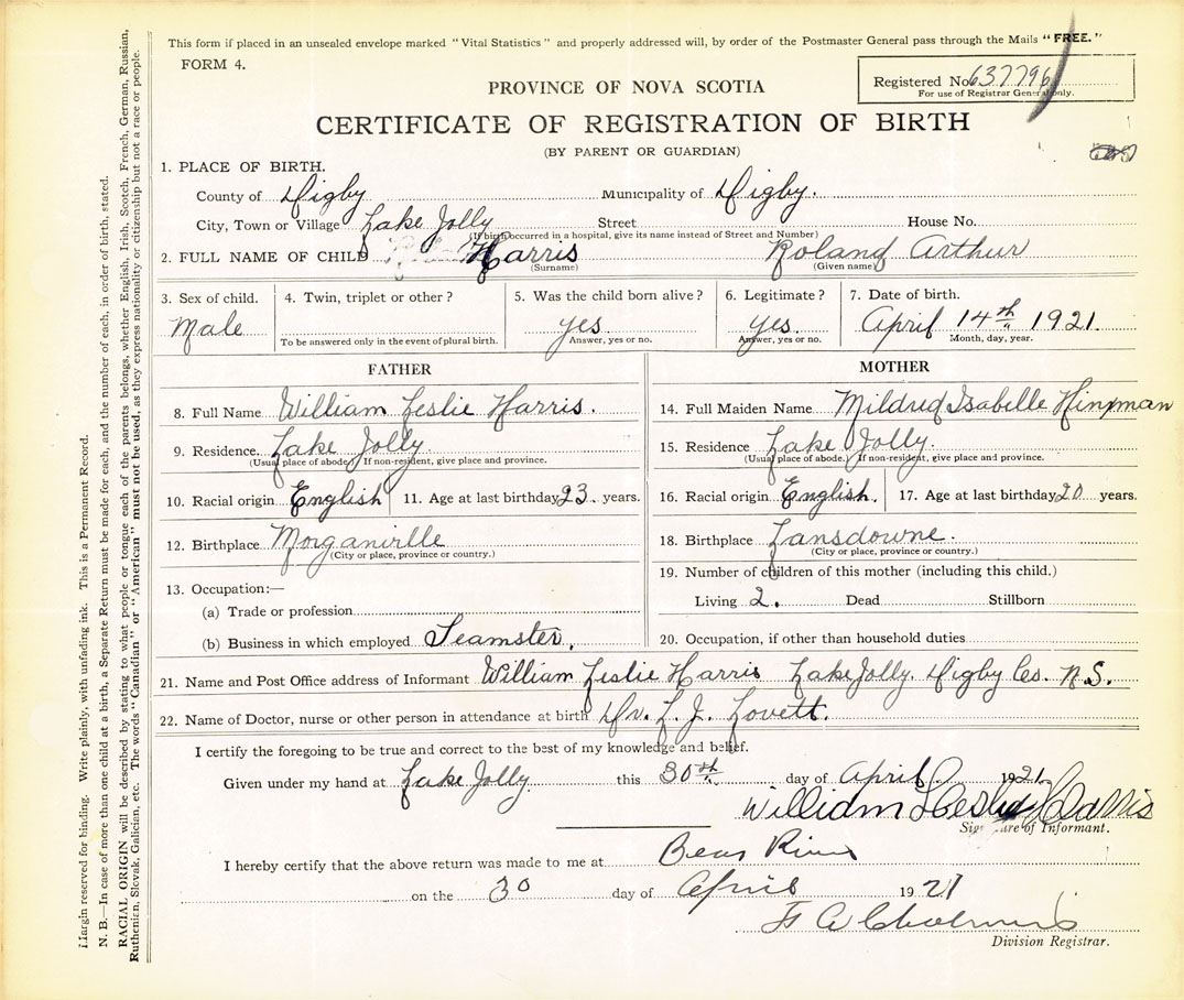 21. Name and Post Office address of Informant William Leslie Harris Lake Jolly, Digby County
