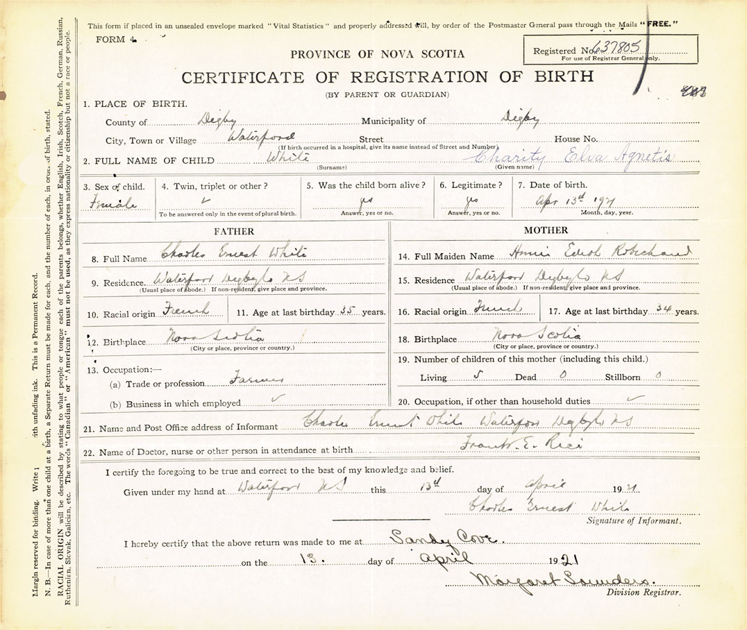 21. Name and Post Office address of Informant Charles Ernest White Waterford, Digby County
