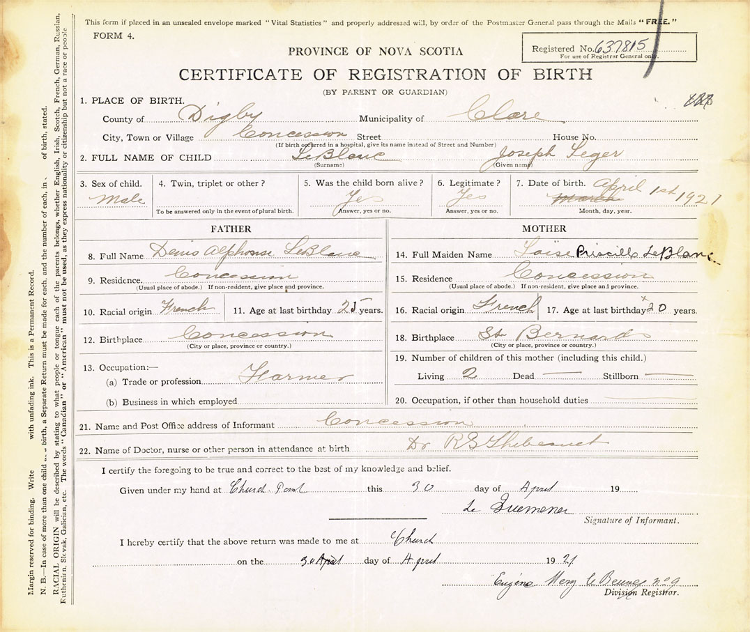2. FULL NAME OF CHILD LeBlanc, Joseph Leger