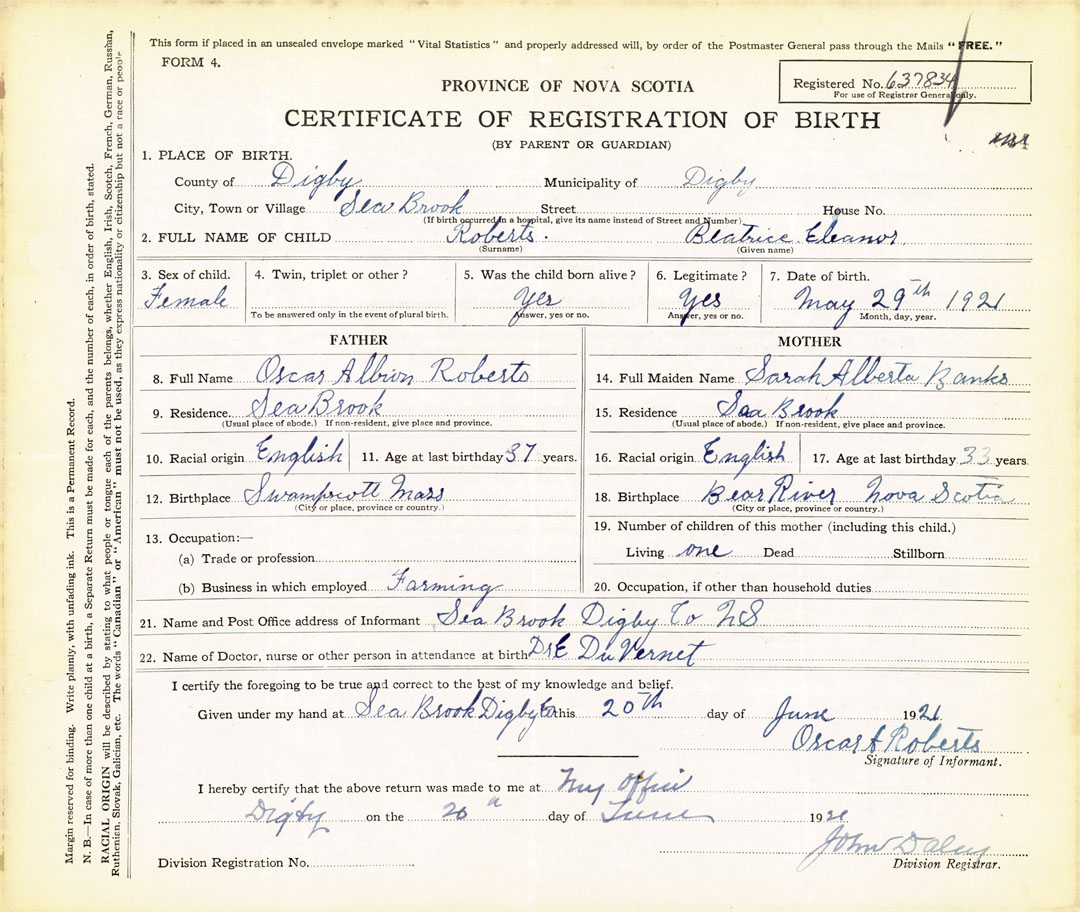 21. Name and Post Office address of Informant Oscar A. Roberts Sea Brook Digby