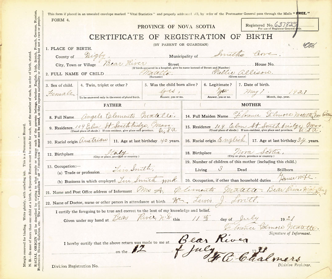 21. Name and Post Office address of Informant Mrs. A. Clements Mattelle Bear River, Digby