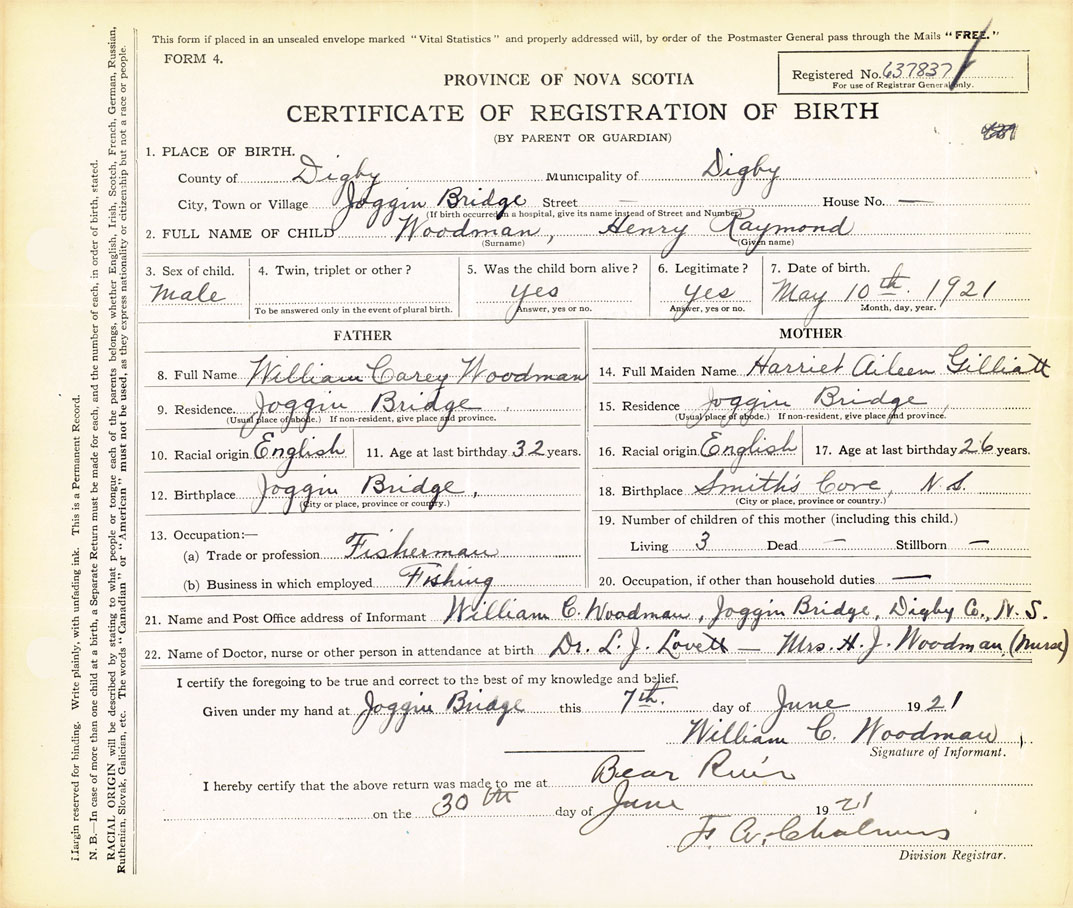 22. Name of Doctor, nurse or other person in attendance at birth Dr. L.J. Lovitt Mrs. H.J. Woodman (Nurse)