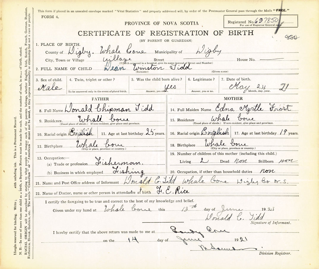 21. Name and Post Office address of Informant Donald C. Tidd Whale Cove, Digby