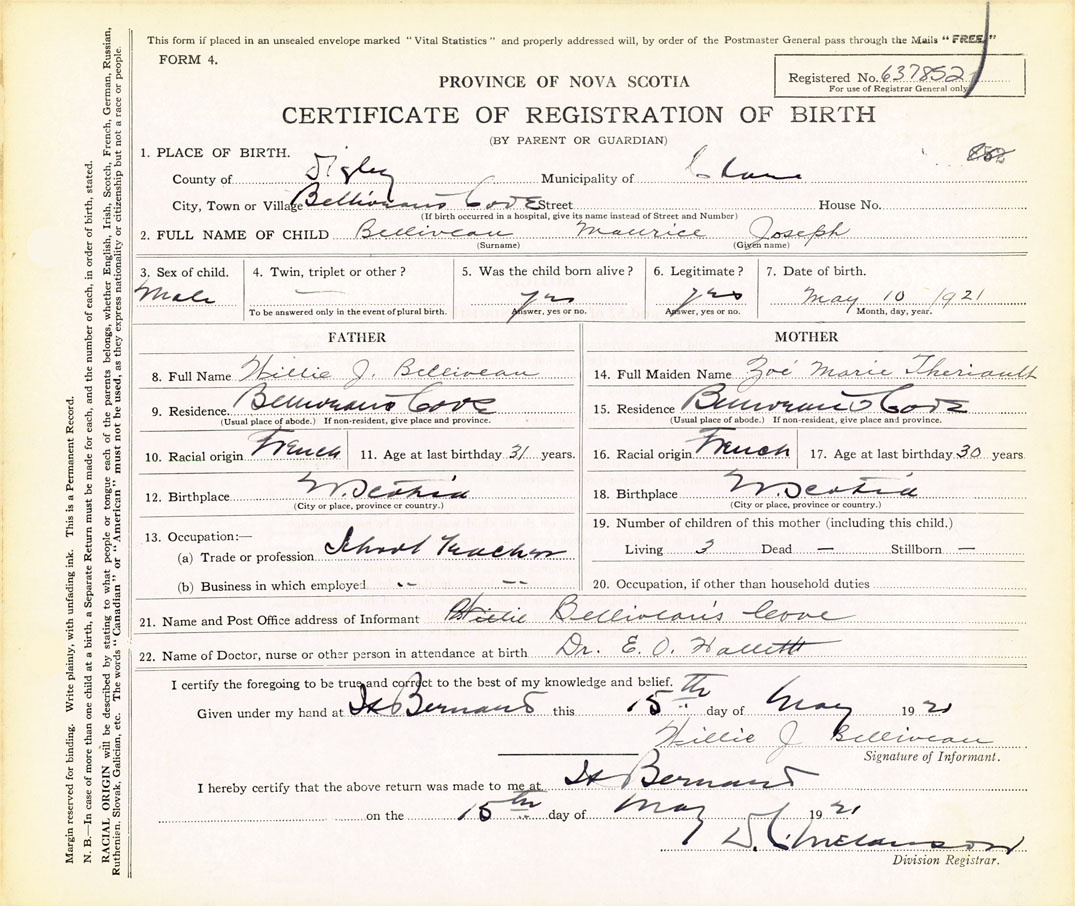 21. Name and Post Office address of Informant Willie Belliveau Belliveau Cove
