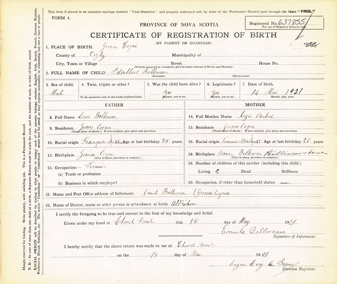 21. Name and Post Office address of Informant Emile Belliveau Grosses Coques