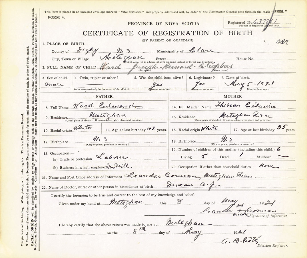 21. Name and Post Office address of Informant Leander Comeau Meteghan River
