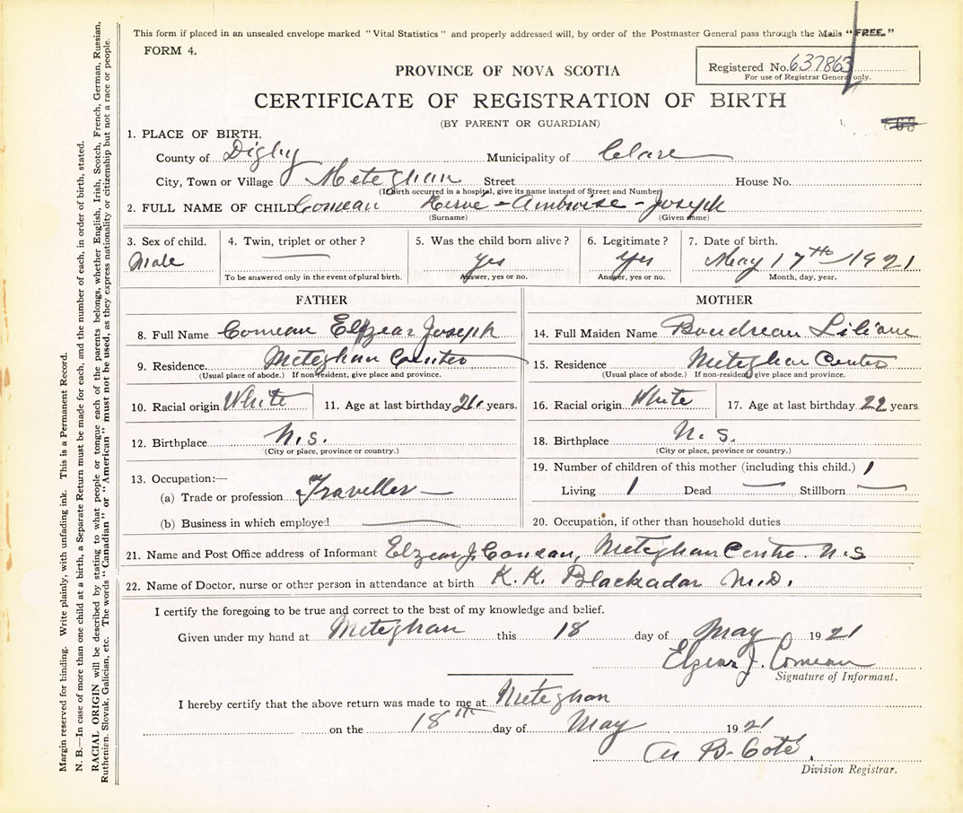 21. Name and Post Office address of Informant Elzear J. Comeau Meteghan Centre