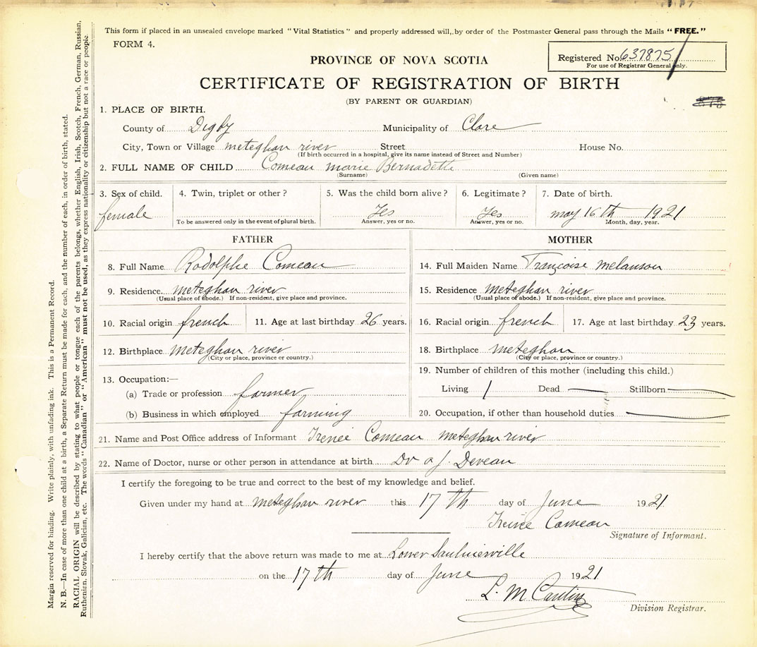 21. Name and Post Office address of Informant Irenee Comeau Meteghan River