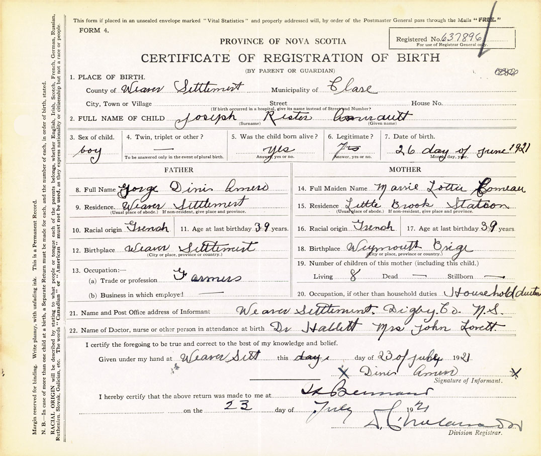 21. Name and Post Office address of Informant Dinis Amero Weaver Settlement, Digby Co