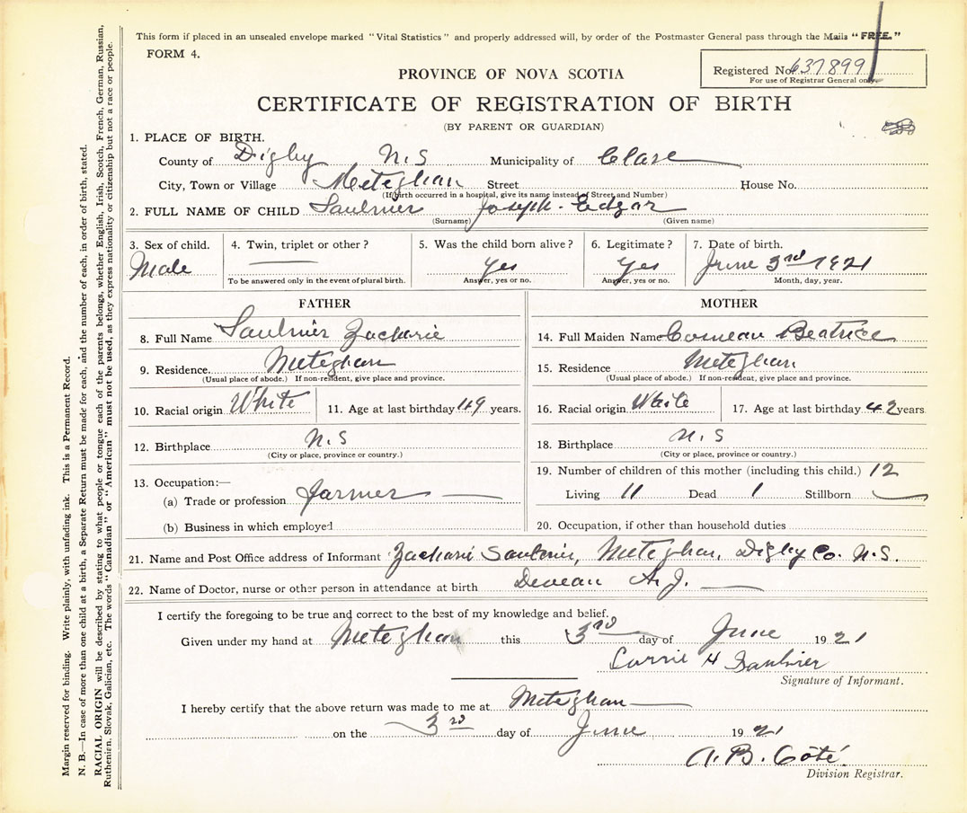 21. Name and Post Office address of Informant Zacharie Saulnier Meteghan, Digby Co