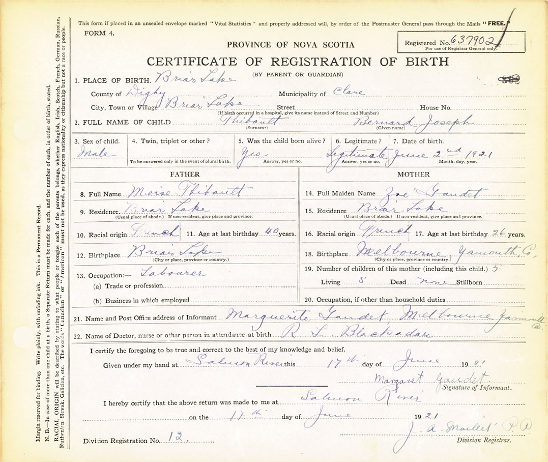 21. Name and Post Office address of Informant Marguerite Gaudet Melbourne, Yarmouth Co
