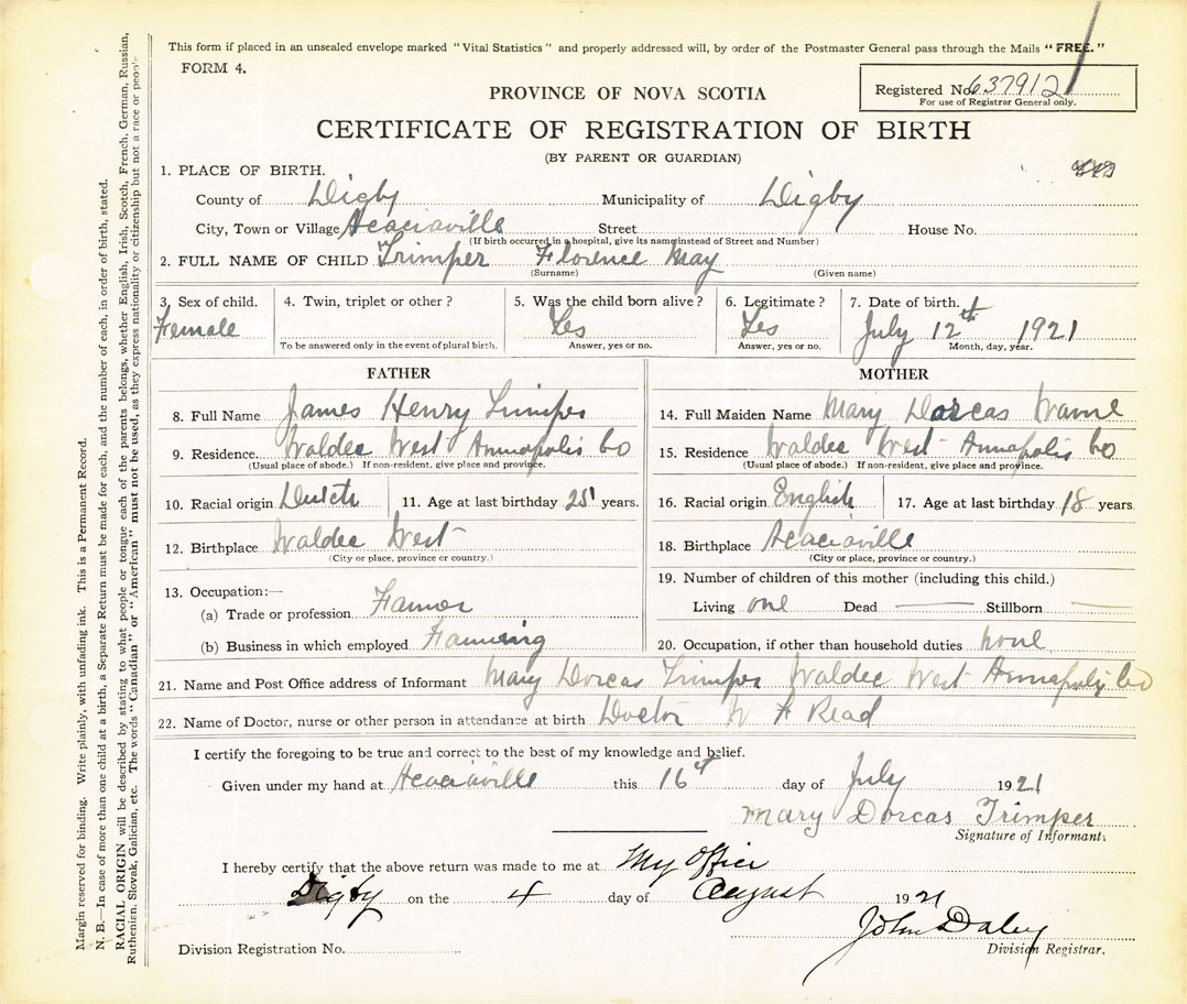 21. Name and Post Office address of Informant Mary Dorcas Trimper Waldec West, Annapolis Co