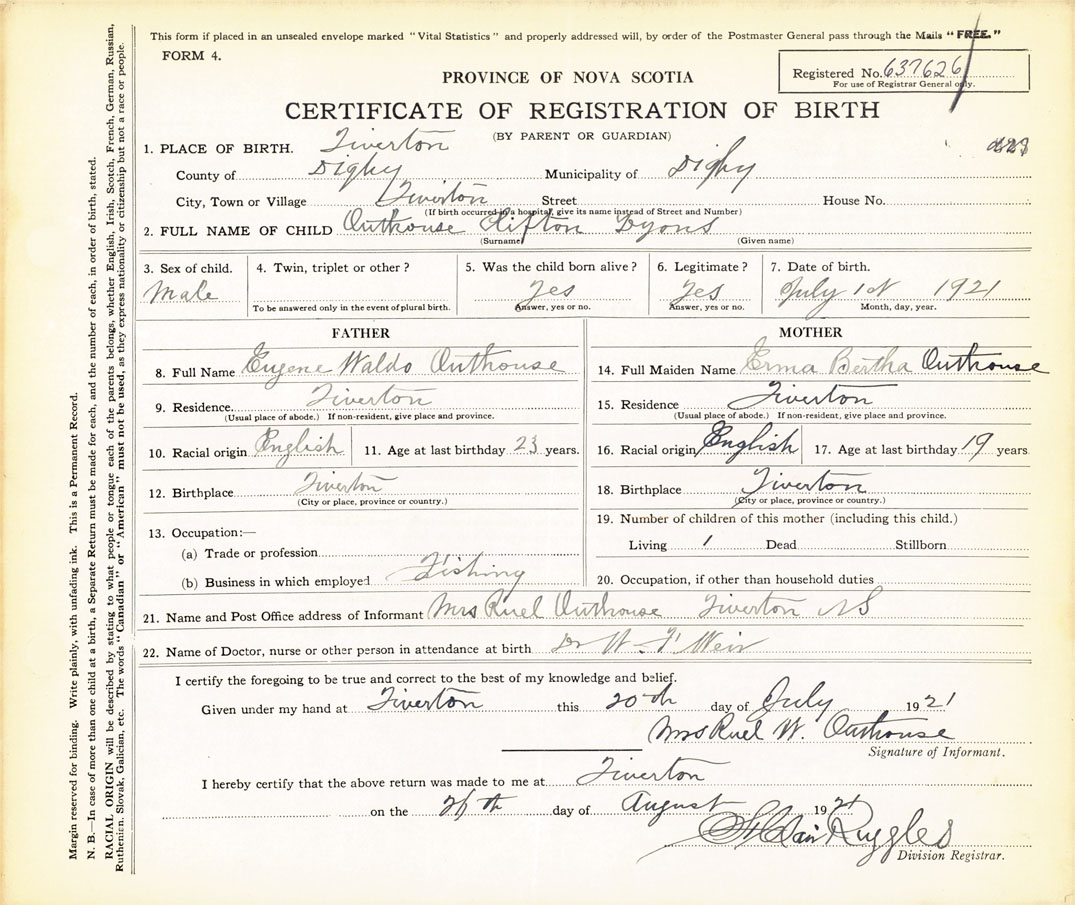 2. FULL NAME OF CHILD Outhouse, Clifton Lyons