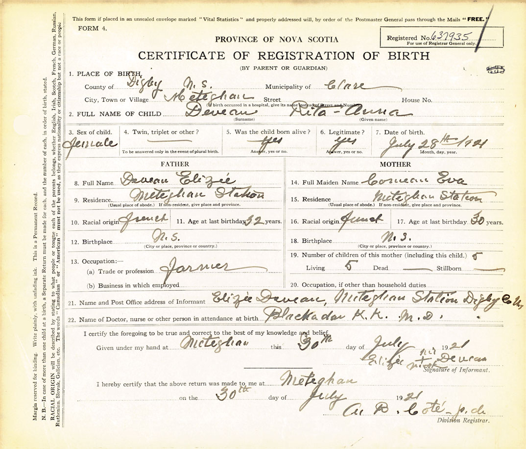 21. Name and Post Office address of Informant Elizie Deveau Meteghan Station, Digby County