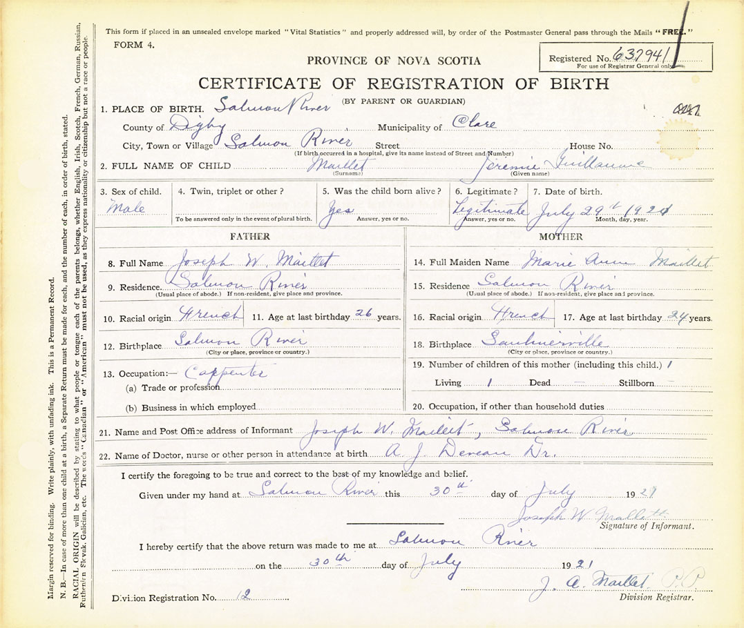 21. Name and Post Office address of Informant Joseph W Maillet Salmon River