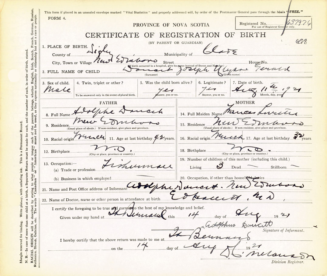 21. Name and Post Office address of Informant Adolphus Doucett New Edinburgh
