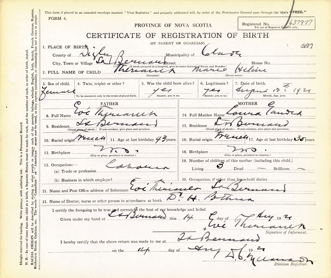 22. Name of Doctor, nurse or other person in attendance at birth Dr. H Pothier