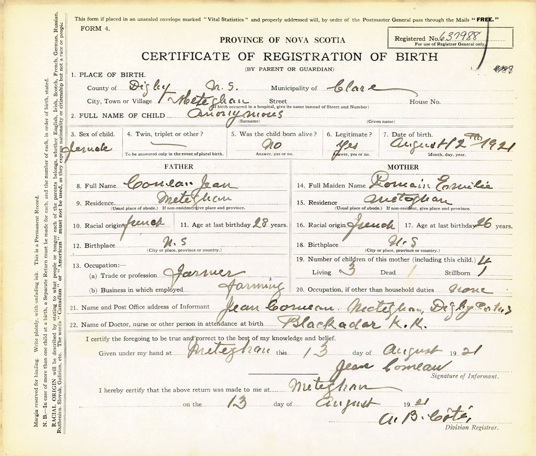 21. Name and Post Office address of Informant Jean Comeau Meteghan, Digby Co