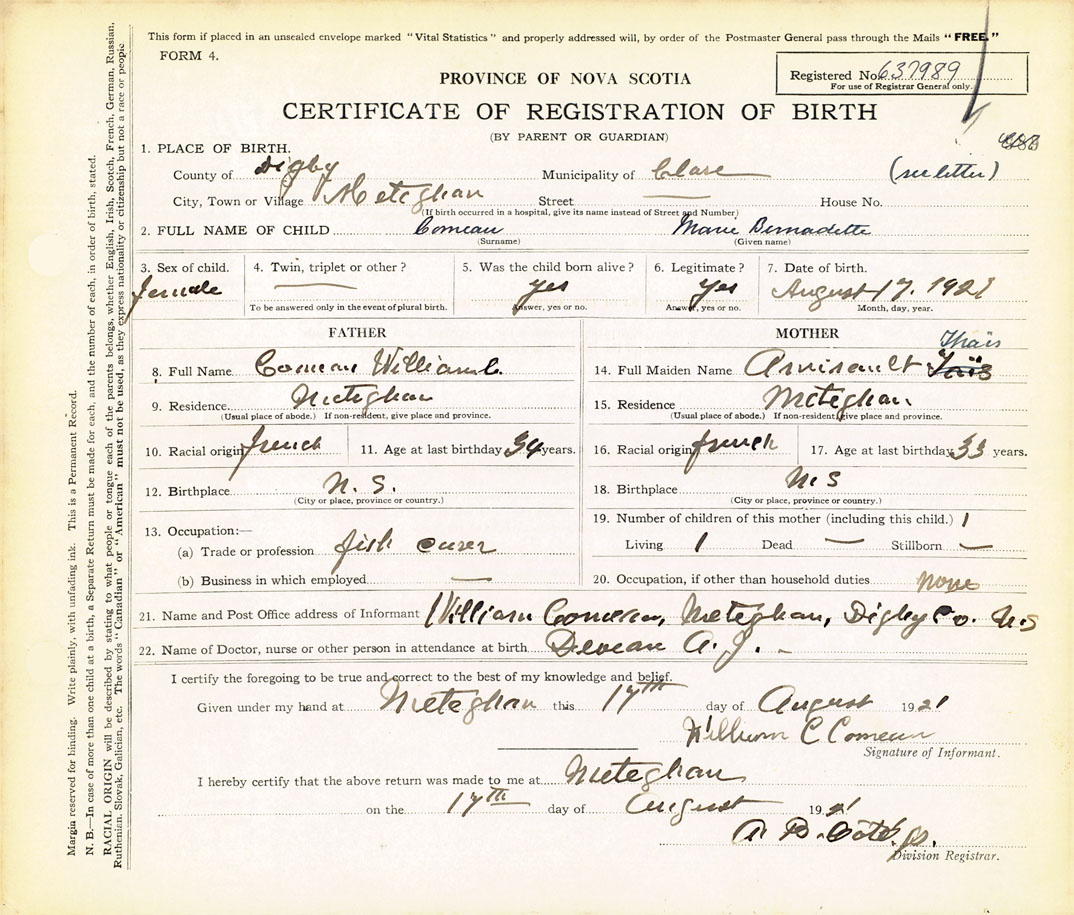21. Name and Post Office address of Informant William C Comeau Meteghan, Digby Co