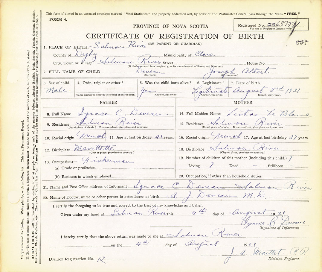 22. Name of Doctor, nurse or other person in attendance at birth A. J. Deveau (M.D.)