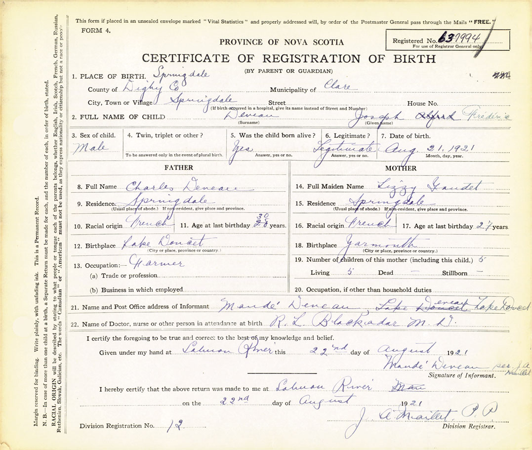 21. Name and Post Office address of Informant Maude Deveau per J. A. Maillet Lake Doucette