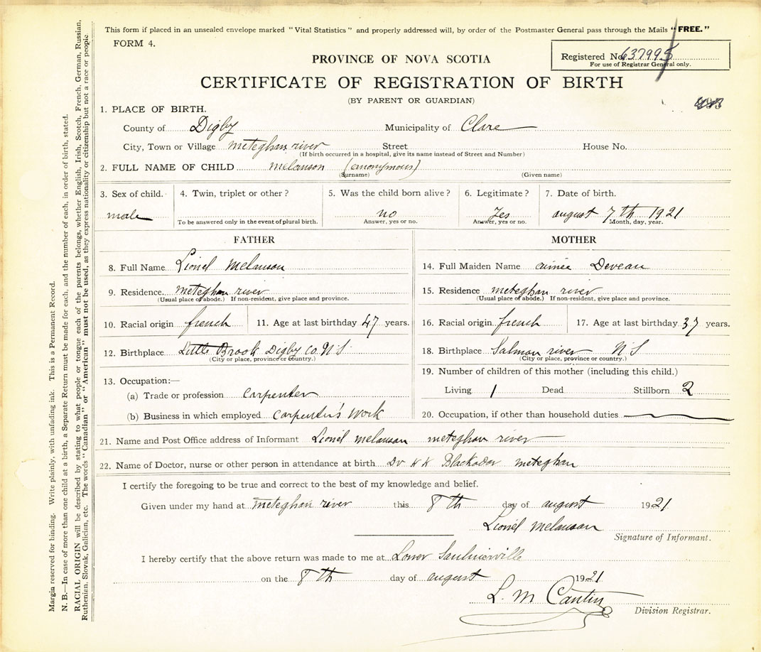 21. Name and Post Office address of Informant Lionel Melanson Meteghan River