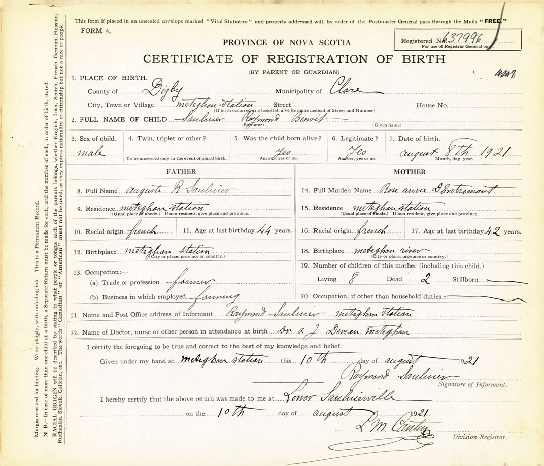 21. Name and Post Office address of Informant Raymond Saulnier Meteghan Station