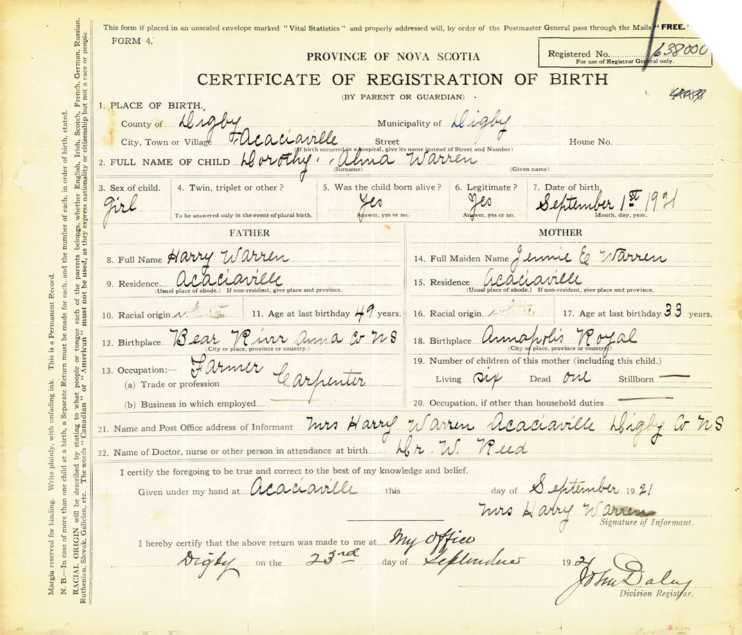21. Name and Post Office address of Informant Mrs Harry Warren Acaciaville, Digby Co