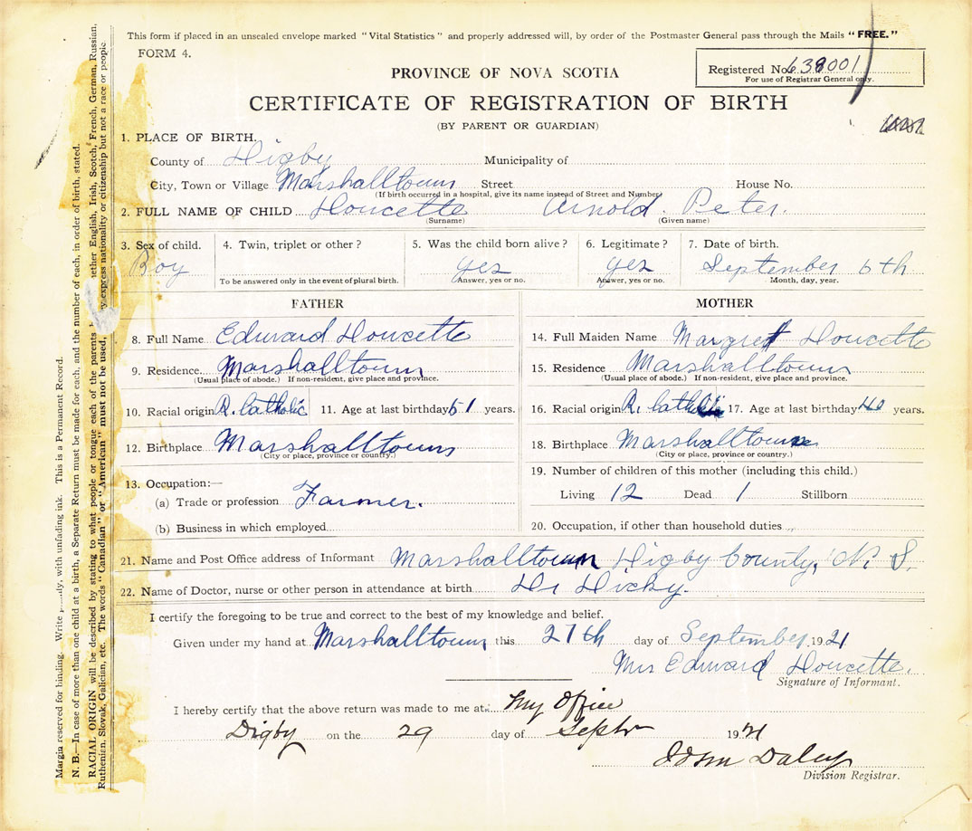 21. Name and Post Office address of Informant Mrs Edward Doucette Marshalltown, Digby Co