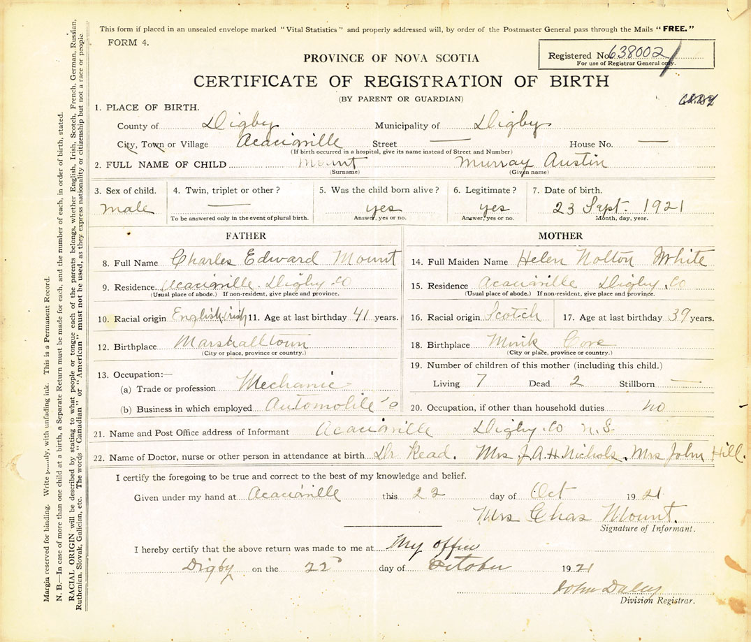 21. Name and Post Office address of Informant Mrs Chas Mount Acaciaville, Digby Co