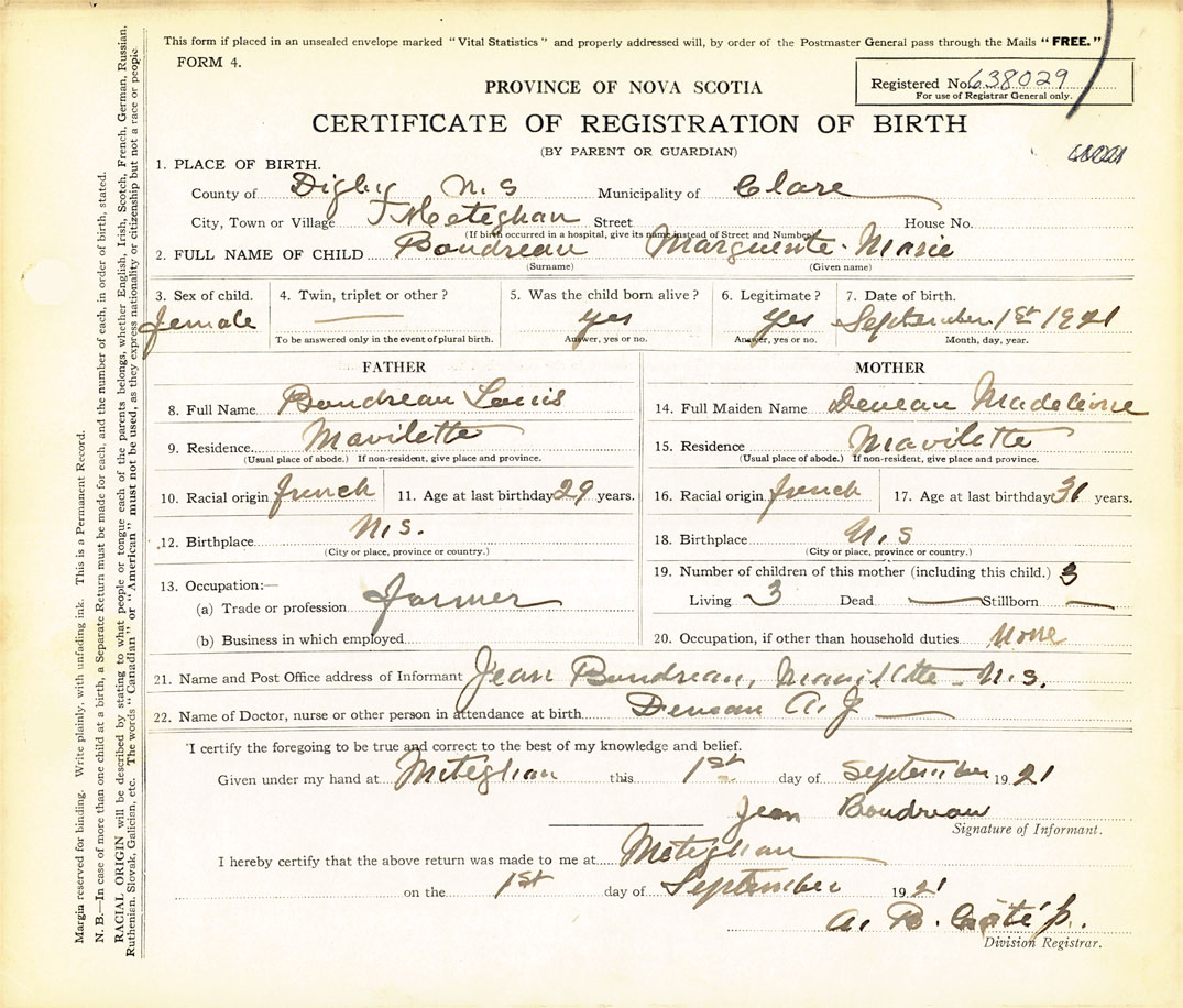 21. Name and Post Office address of Informant Jean Boudreau Mavilette N.S.