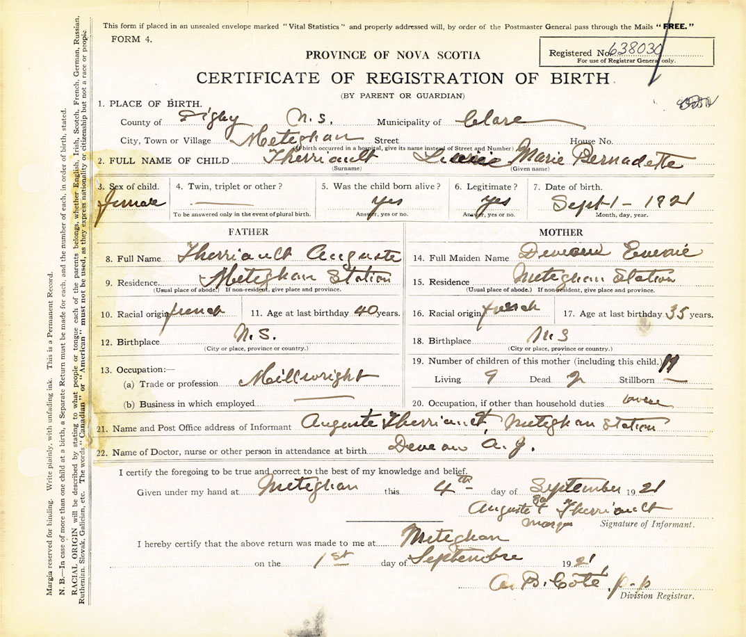21. Name and Post Office address of Informant Auguste Therriault Meteghan Station