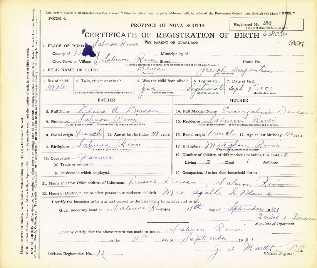 21. Name and Post Office address of Informant Desire Deveau Salmon River