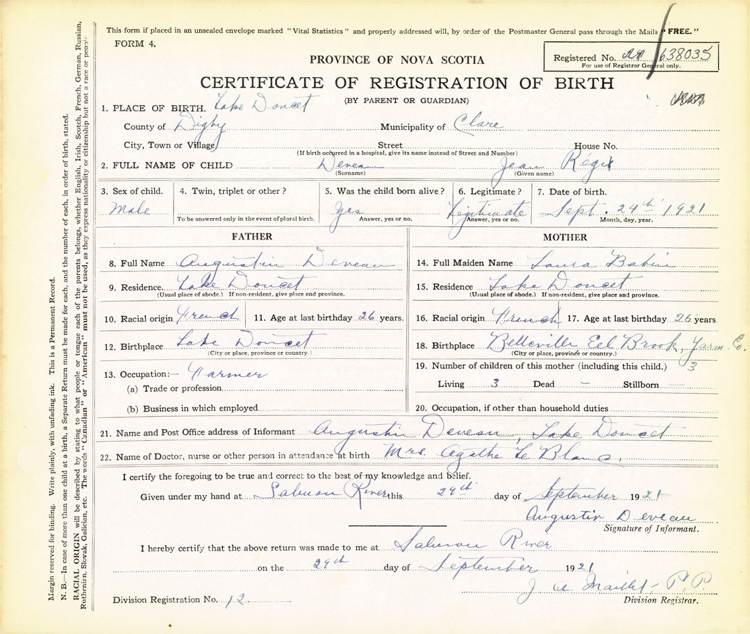 21. Name and Post Office address of Informant Augustin Deveau Lake Doucette