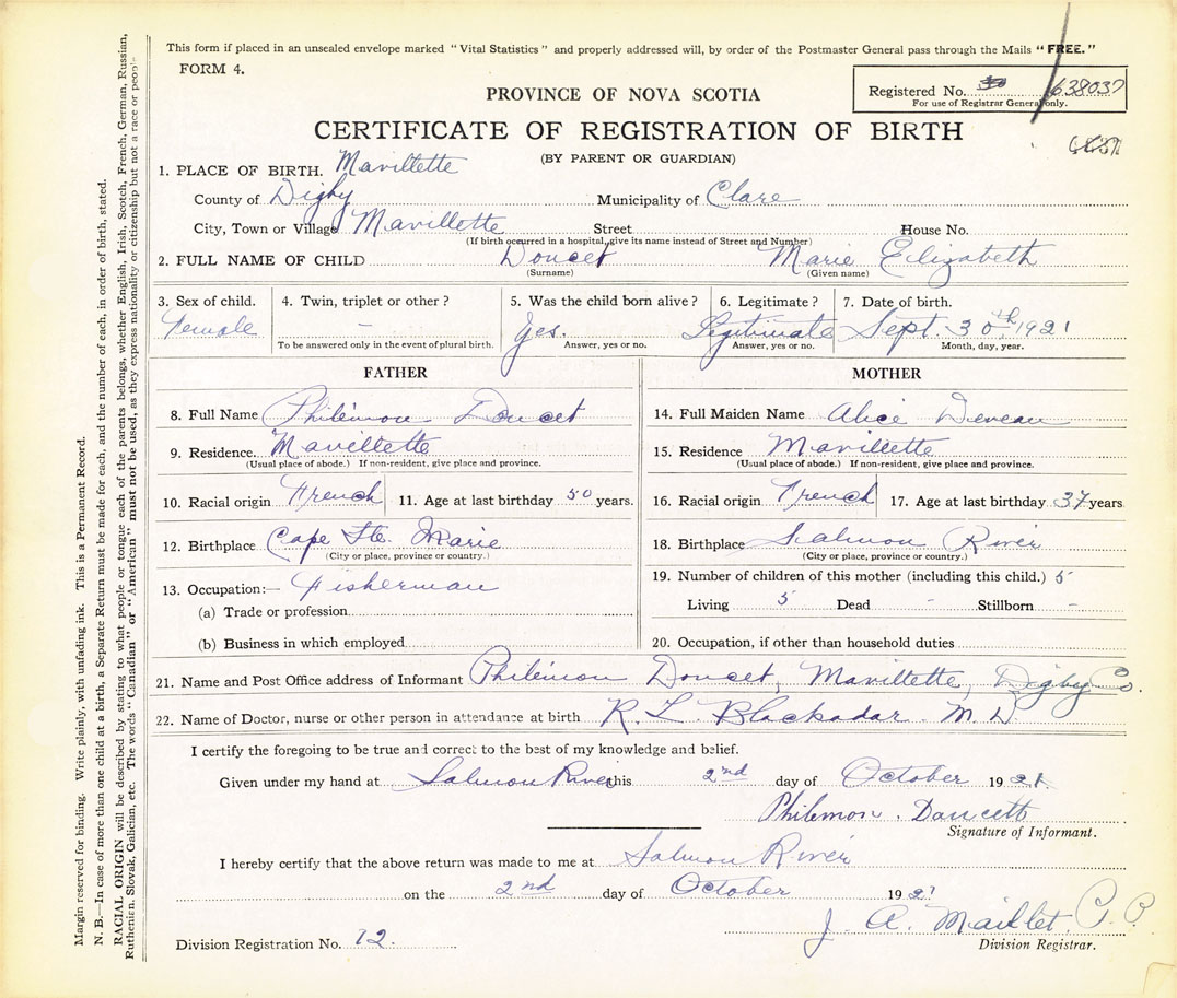 21. Name and Post Office address of Informant Philemon Doucett Mavillette, Digby Co