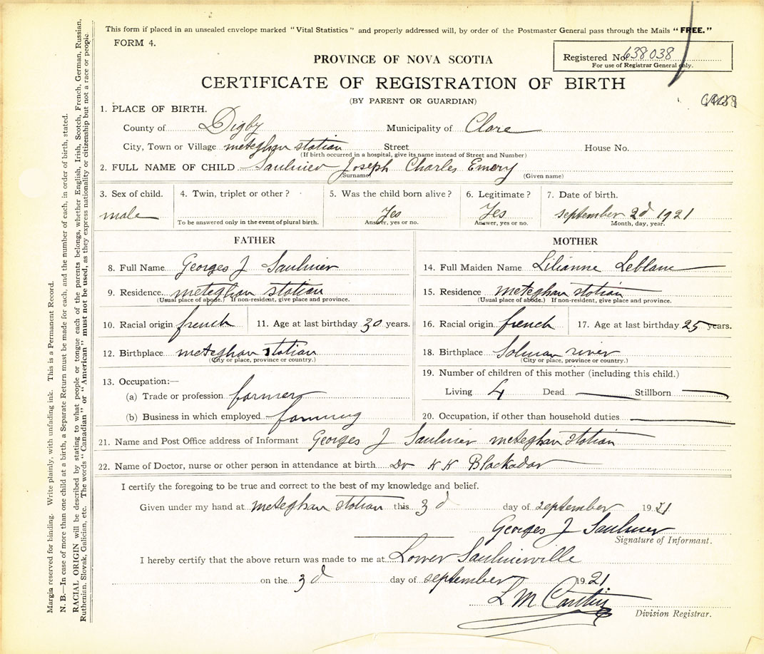21. Name and Post Office address of Informant Georges J Saulnier Meteghan Station