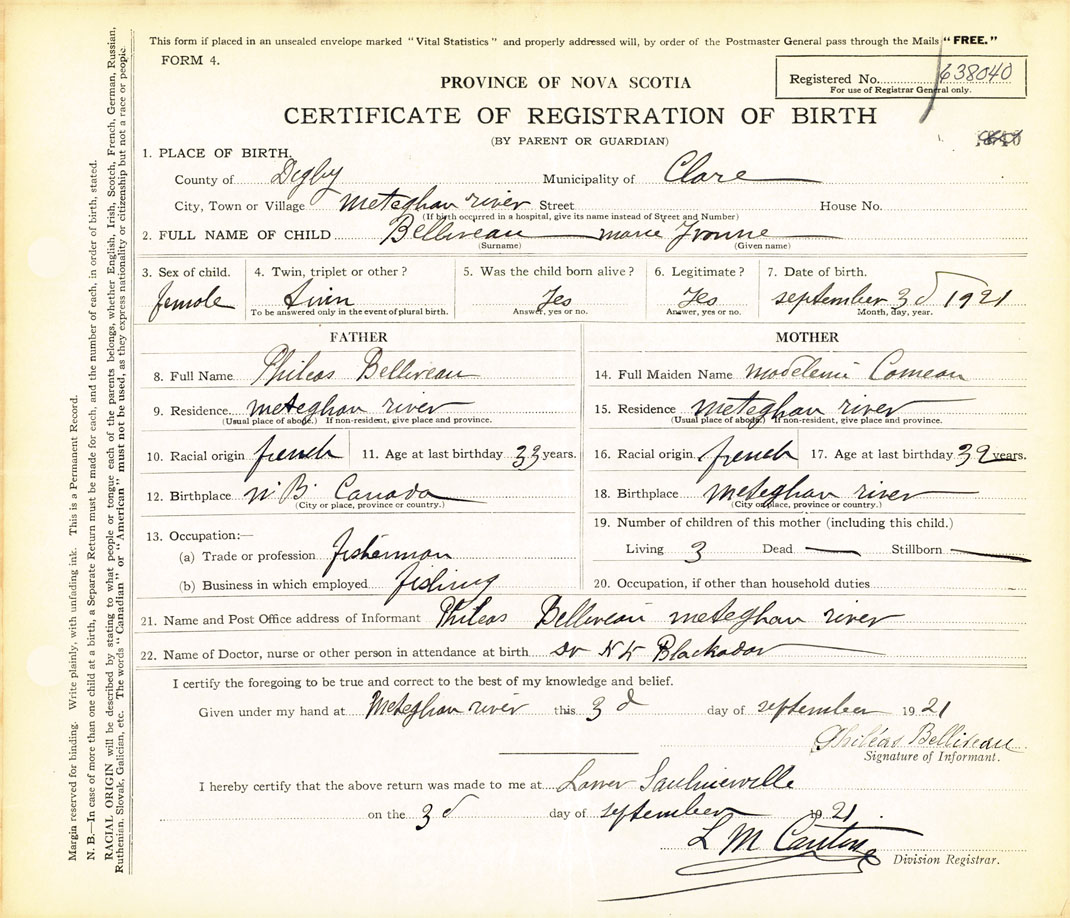 21. Name and Post Office address of Informant Phileas Belliveau Meteghan River