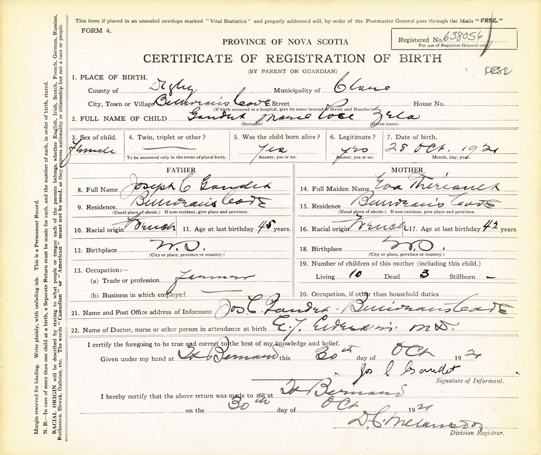 21. Name and Post Office address of Informant Joseph C Gaudet Belliveaus Cove