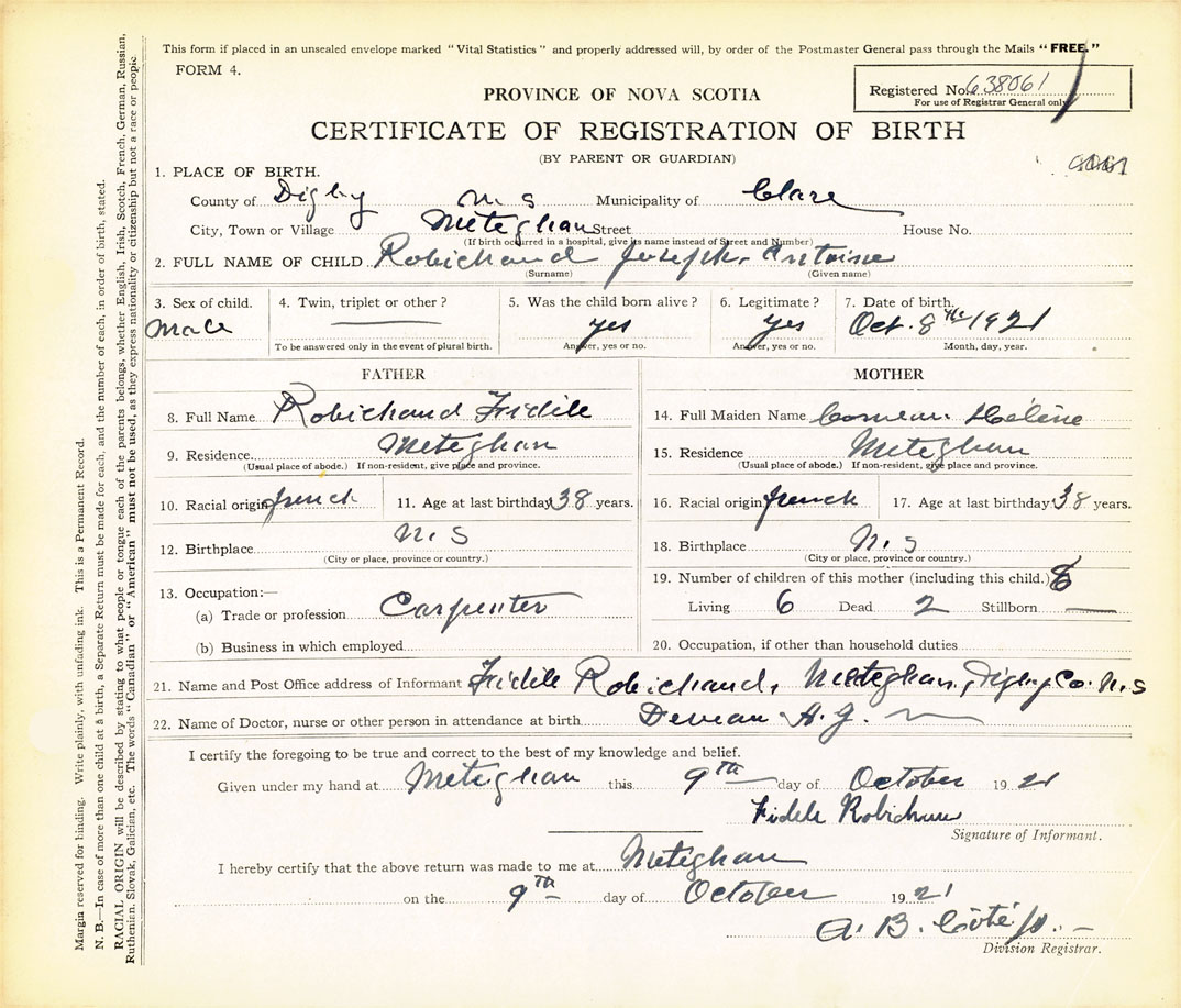 21. Name and Post Office address of Informant Fidele Robicheau Meteghan, Digby Co