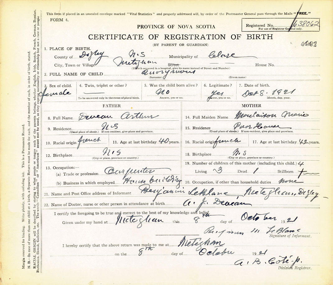 21. Name and Post Office address of Informant Benjamin LeBlanc Meteghan, Digby County