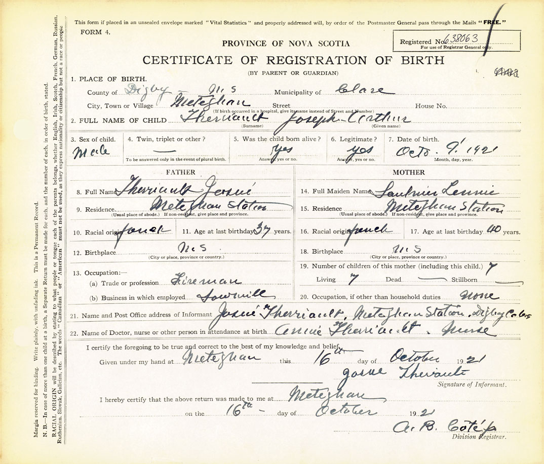21. Name and Post Office address of Informant Josué Theriault Meteghan Station, Digby Co