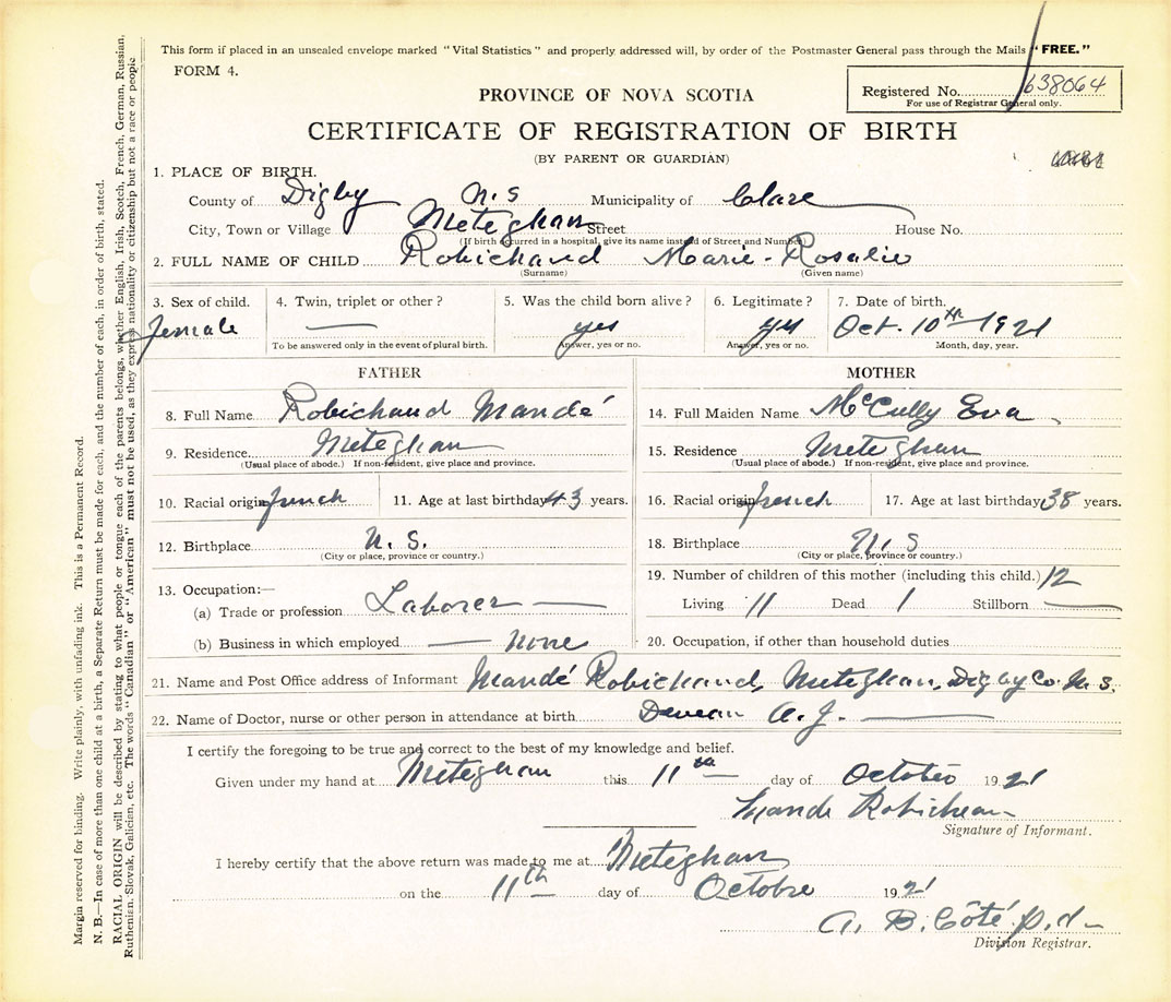21. Name and Post Office address of Informant Mandé Robichaud Meteghan, Digby Co