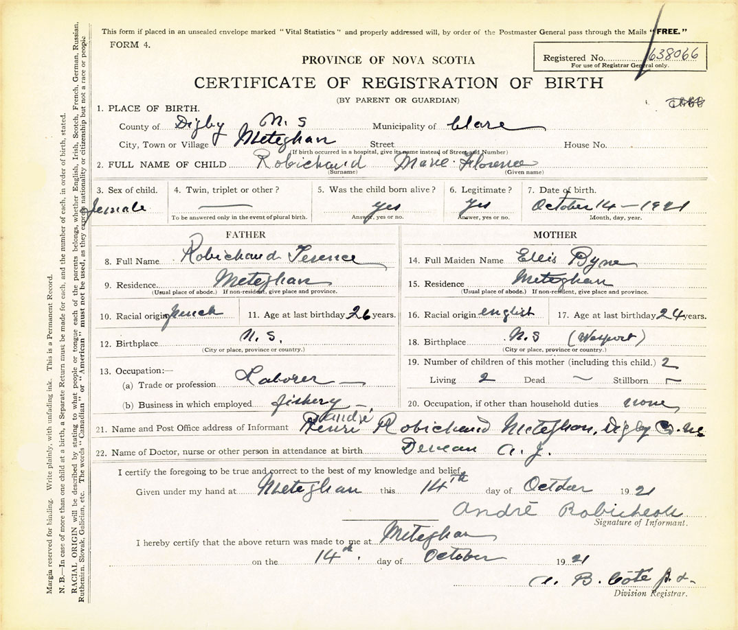 21. Name and Post Office address of Informant André Robichaud Meteghan