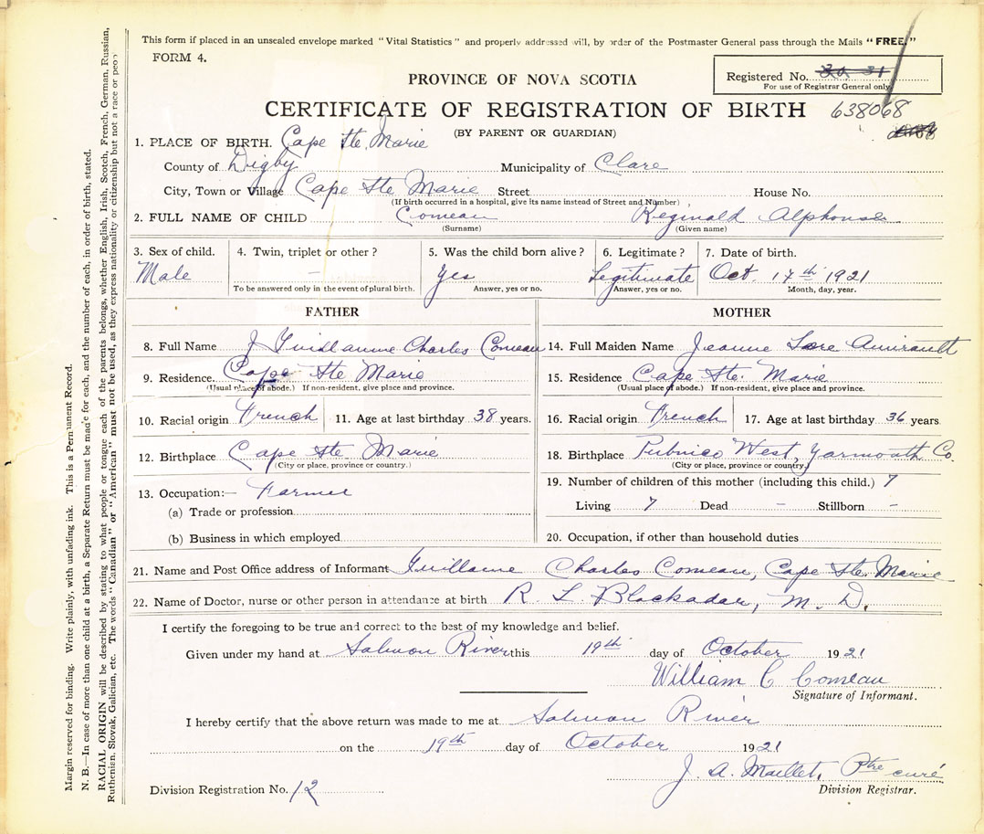 21. Name and Post Office address of Informant Guillaume Charles Comeau Cape Ste Marie