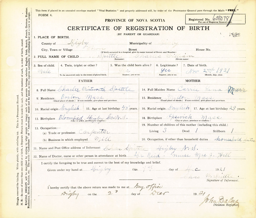 21. Name and Post Office address of Informant Charles W Spittle Digby