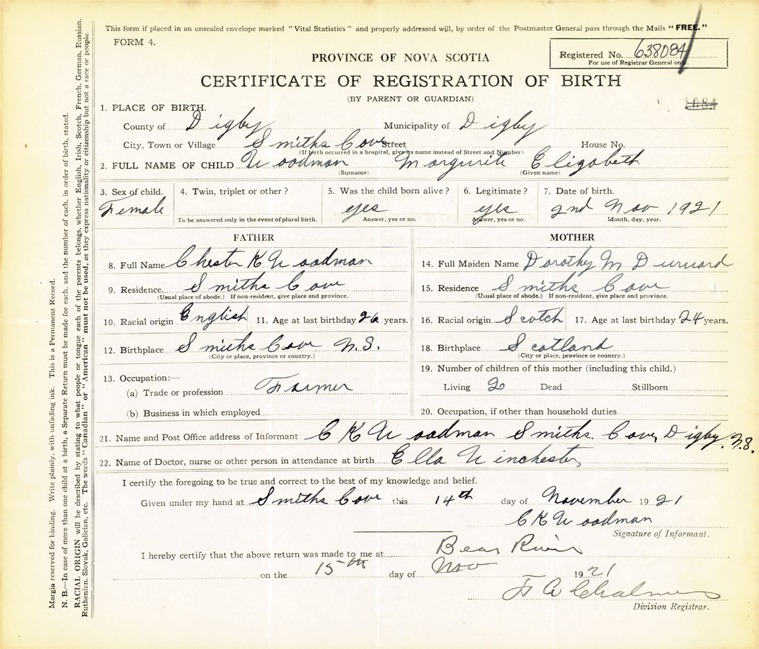 21. Name and Post Office address of Informant C K Woodman Smiths Cove, Digby