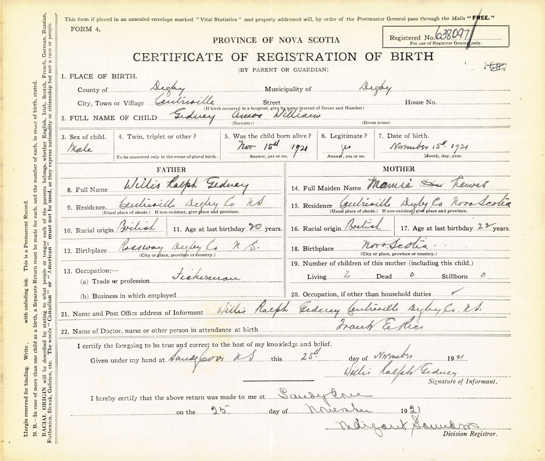 21. Name and Post Office address of Informant Willis Ralph Gidney Centreville, Digby Co