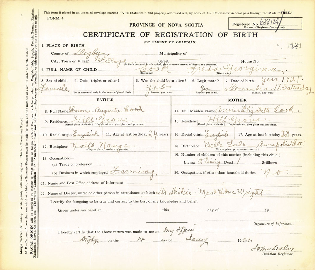22. Name of Doctor, nurse or other person in attendance at birth Dr. Dickie, Mrs. Love Wright