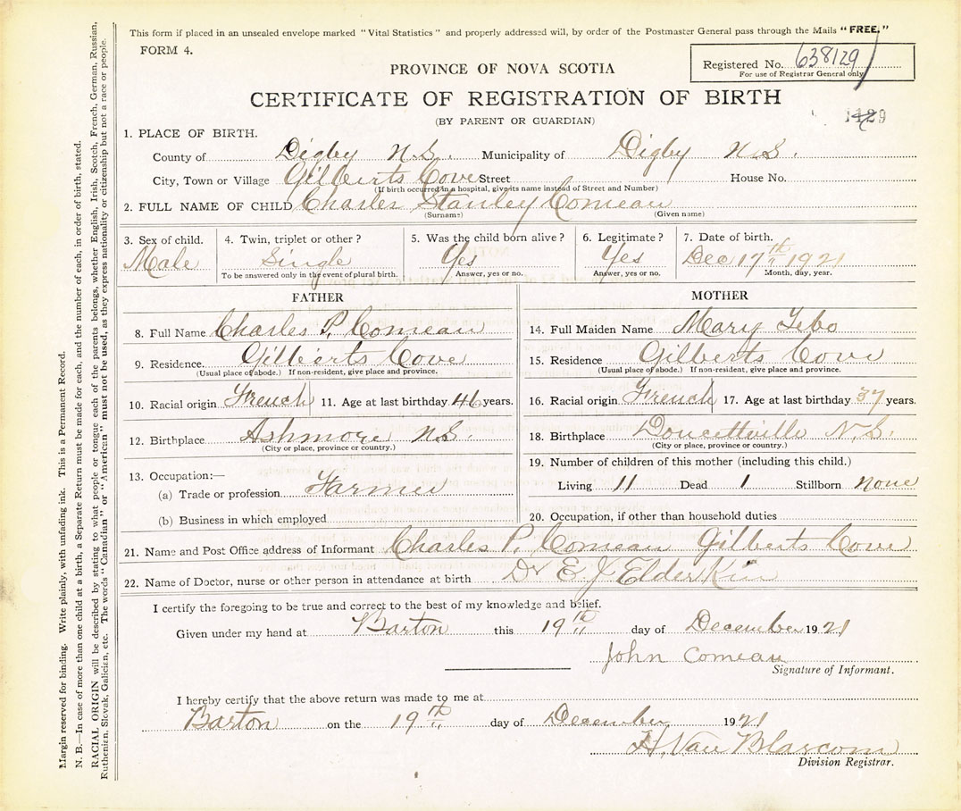 21. Name and Post Office address of Informant Charles P Comeau Gilberts Cove
