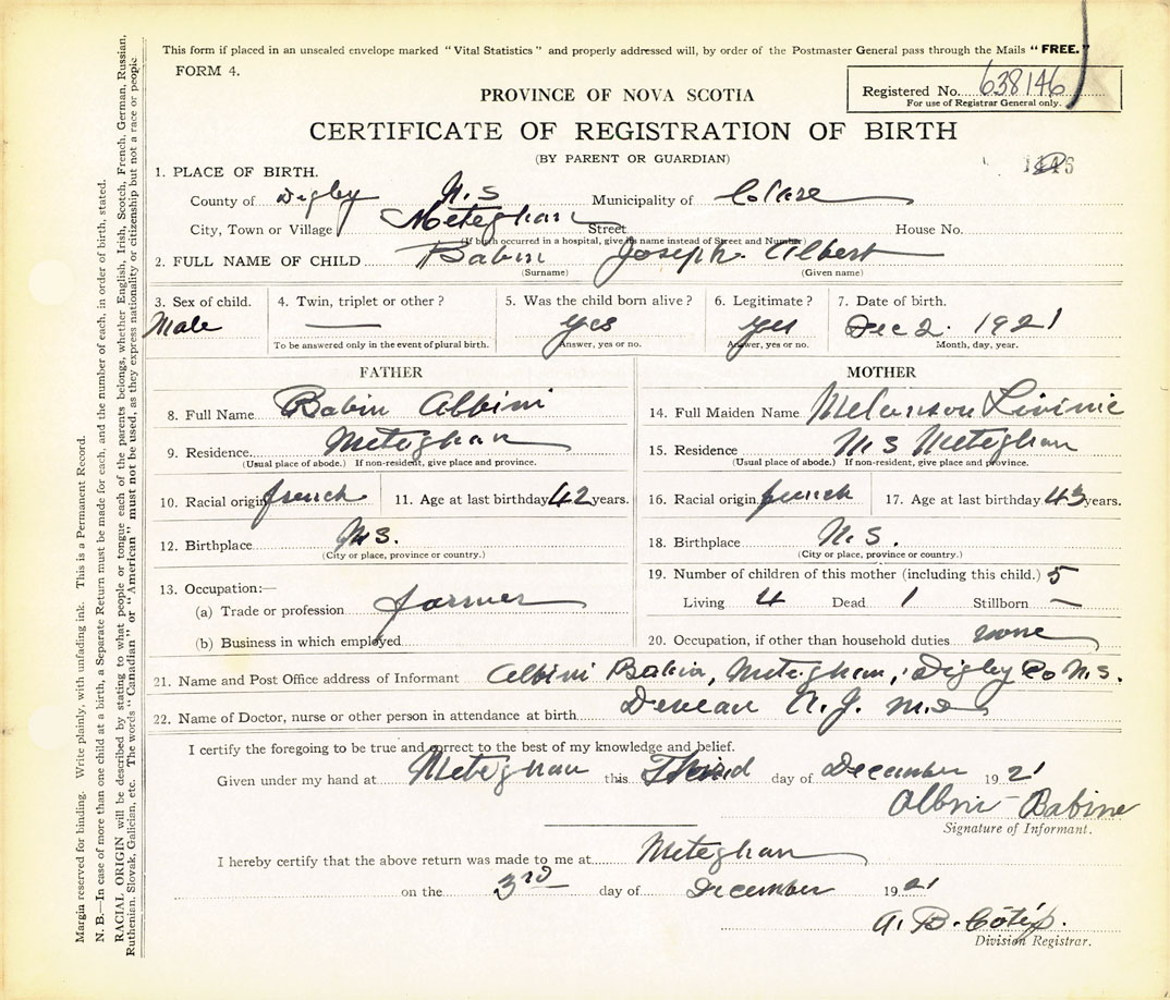 21. Name and Post Office address of Informant Albini Babin Meteghan, Digby Co N.S.